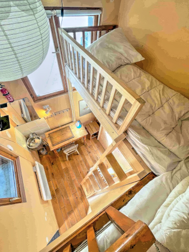 Une chambre dans annexe accessible par balcon ouest à deux lits en mezzanine 90x190 - zone bureau - lavabo -rangements intégrés